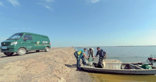 王海进在渔船码头送特快专递。